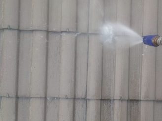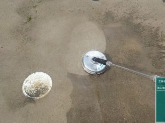 高圧洗浄作業。 高圧洗浄にて汚れや、チョーキングの粉をしっかり落とすことにより、塗料の密着性が高まるため、この作業はとても大切な作業となります。