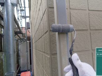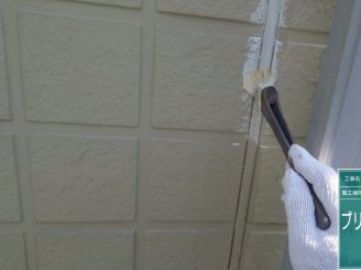 こちらは、目地部分にはメーカーのゴムパッキンが使用されておりますが、このまま塗装をしてしまうとブリード現象が発生し、将来的に色が変色してきてしまうため、目路部分にも専用のプライマーを塗布します。