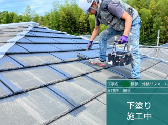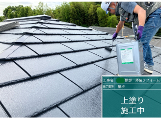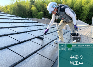 屋根 上塗り施工中 屋根の塗装には高い反射率で遮熱効果のある無機遮熱塗料を使用しました。
