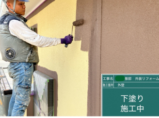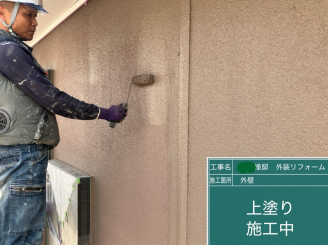 外壁 上塗り施工中 外壁塗装には2コートタイプの無機塗料を使用し、施工費を抑えつつ高耐久性のバランスの取れた塗料を使用しました。