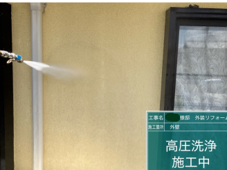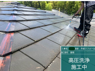 屋根 高圧洗浄作業 高圧洗浄にて汚れや、チョーキングの粉をしっかり落とすことにより、塗料の密着性が高まるため、この作業はとても大切な作業となります。