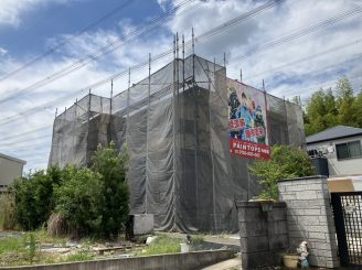 足場設営。職人の安全はもちろん、塗装のムラを防ぎ、仕上がりの美しさにもつながります。 飛散防止ネットで近隣への配慮も◎ 足場があるからこそ、安心・高品質な工事が実現します