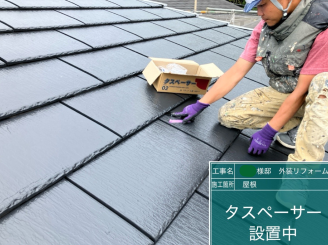 屋根 タスペーサー挿入中 タスペーサーは塗料で瓦の隙間が埋まってしまうのを防ぐために行います。