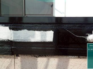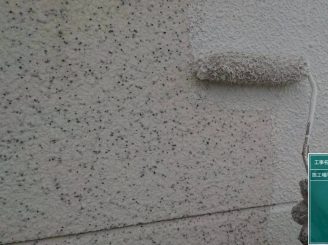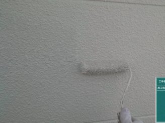 外壁中塗り塗装中 今回使用するのは下塗り+上塗りの2工程で仕上げる、2コートタイプの塗装です。