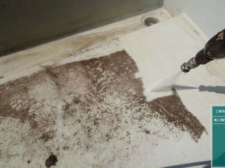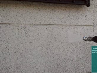 外壁 高圧洗浄作業 高圧洗浄にて汚れや、チョーキングの粉をしっかり落とすことにより、塗料の密着性が高まるため、この作業はとても大切な作業となります。