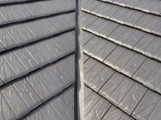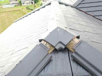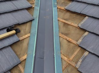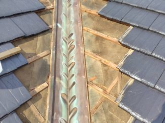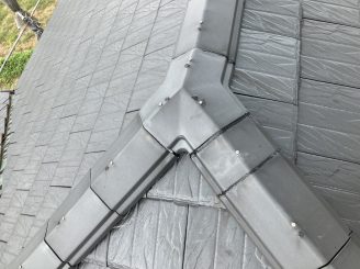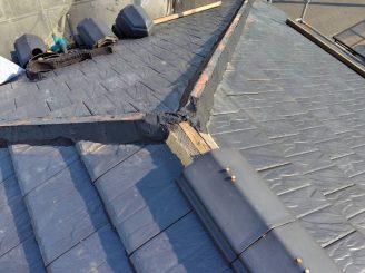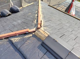屋根補修工事➡棟がずれていたため、棟の工事と、谷板金の取替工事を行いました。