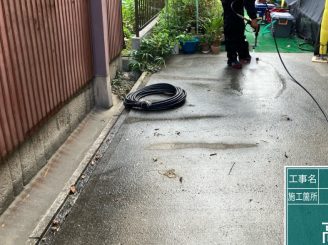 土間コンクリート高圧洗浄作業 外壁や屋根はもちろん、駐車場土間コンクリートも綺麗にさせて頂いております。