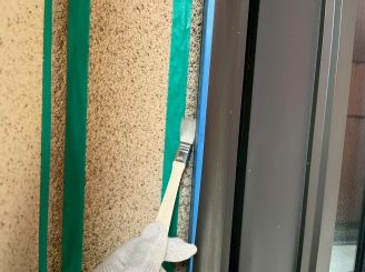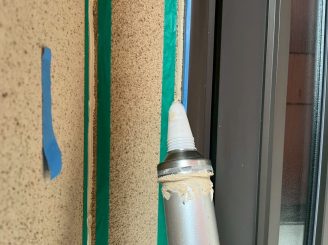 サッシ周りシーリング作業 サッシ周りは増し打ちと呼ばれる、既存のシーリングの上から新しいシーリングを打設する方法が通常です。