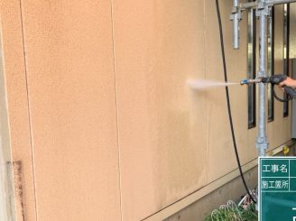 外壁高圧洗浄作業 高圧洗浄にて汚れや、チョーキングの粉をしっかり落とすことにより、塗料の密着性が高まるため、この作業はとても大切な作業となります。
