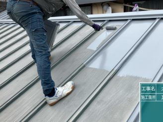 屋根上塗り塗装中 屋根使用塗料➡セミフロンスーパールーフ遮熱 夏期の省エネルギーへの貢献、ヒートアイランド現象の効果的な 抑止策として期待できる遮熱塗料への対応もしており、従来 の遮熱塗料に比べ耐候性・遮熱性に優れるシステムを採用して いる塗料です。 そのため10~20℃(気象条件・塗装色にも因ります) 程度、表面温度を抑制し、熱劣化を抑制致します。