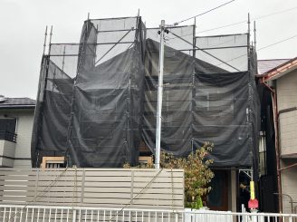 足場設営。 職人の安全はもちろん、塗装のムラを防ぎ、仕上がりの美しさにもつながります。 飛散防止ネットで近隣への配慮も◎ 足場があるからこそ、安心・高品質な工事が実現します!