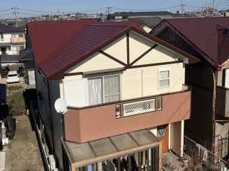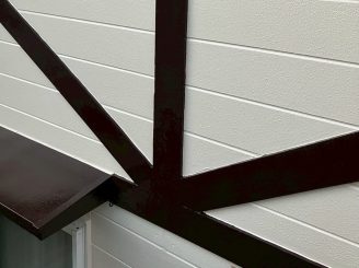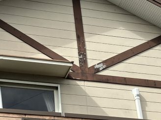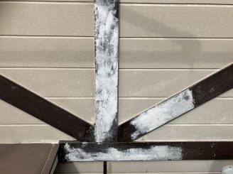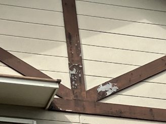 破風塗膜の劣化 表面の塗膜がよく見ると剥離し、水を吸収しやすい状態になっています。