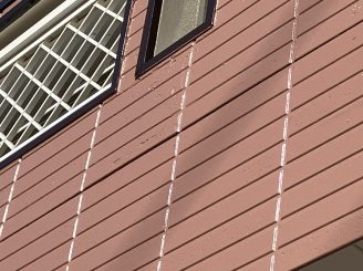 外壁の反り 建材に軽度の反りが発生しています。吸水を続けた建材が湿潤乾燥の繰り返しで変形をしている状態です。